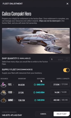 Each spaceship that is enlisted for a mission will reward you in ATLAS each day, but it will also have maintenance and resupplying costs. Currently, there are four types of resources that an enlisted spaceship will require: Fuel, Food, Ammo, and Repair or Toolkit.