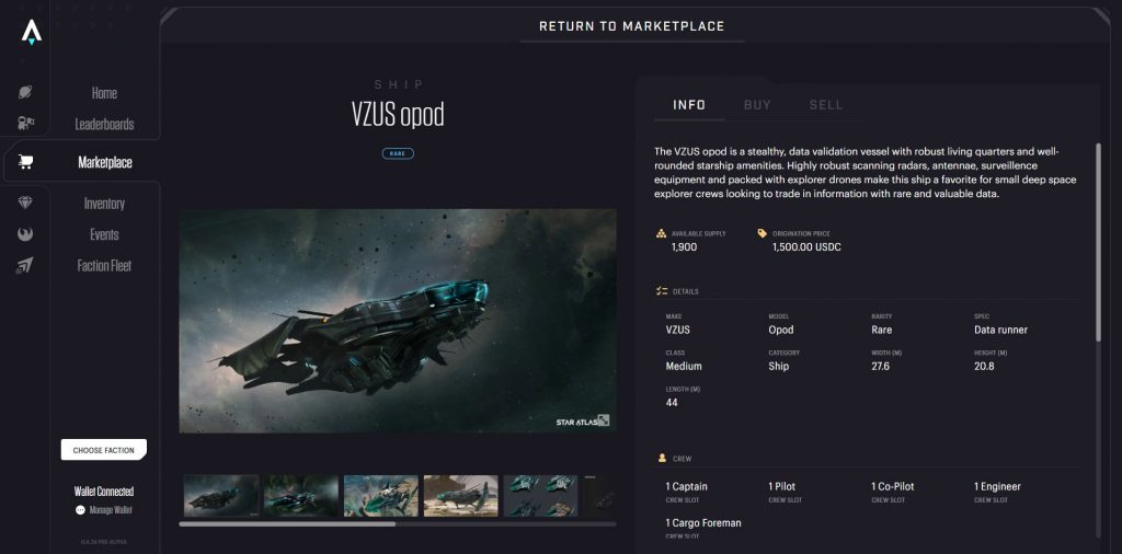 This is where the real work begins! In Star Atlas, you should own at least one spaceship to be able to send it on missions and earn money out of it. Currently, there is a wide variety of spaceships in the game, and the cheapest one will cost you 20 USDC or a bit higher than 200 ATLAS.