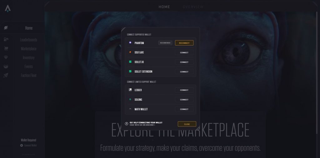 Now that you have all the requirements, head to the Star Atlas webpage to set up your gaming account. On the bottom left corner of the screen, click on Connect Wallet and then connect your Phantom wallet into the game.